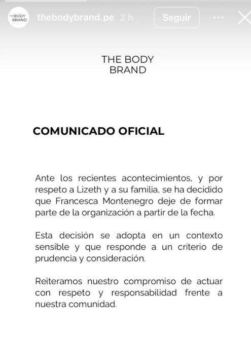 La marca de ropa deportiva The Body Brand no tuvo piedad con la joven. Apenas el escándalo subió de tono, decidieron cortarle la cabeza a Francesca para “limpiar” su imagen corporativa. La sacaron de las campañas y la borraron de sus redes sociales como si nunca hubiera existido. La dejaron sola y sin sustento cuando más apoyo necesitaba. Es increíble cómo una empresa puede darle la espalda a su imagen principal por un chisme de pareja.