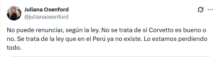 La comunicadora se lanzó con todo a través de sus redes sociales para cuestionar esta salida. Sus palabras exactas fueron: “No se trata de si Corvetto es bueno o no. Se trata de la ley que en el Perú ya no existe. Lo estamos perdiendo todo.”