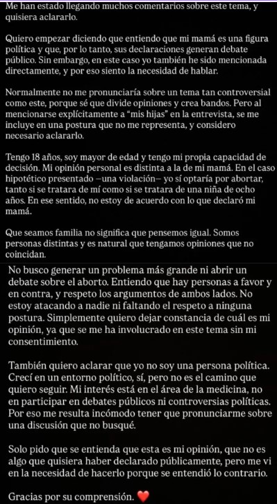 Resulta indignante ver cómo la maquinaria del odio se encendió contra una chica que solo quiere estudiar medicina. Los grupos de izquierda, desesperados por atacar a su madre, no tuvieron piedad. Empezaron a presionar, a insultar y a crear una tormenta en redes sociales para obligarla a hablar. ¡Es una infamia! La acorralaron contra la pared hasta que no le quedó más remedio que salir a defenderse públicamente sobre un tema que desgarra el alma: el aborto en niñas violadas.